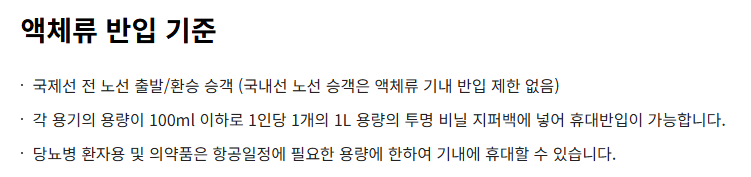 정확한 액체류 반입 물품은 항공보안 365" 홈페이지에서 확인가능합니다.